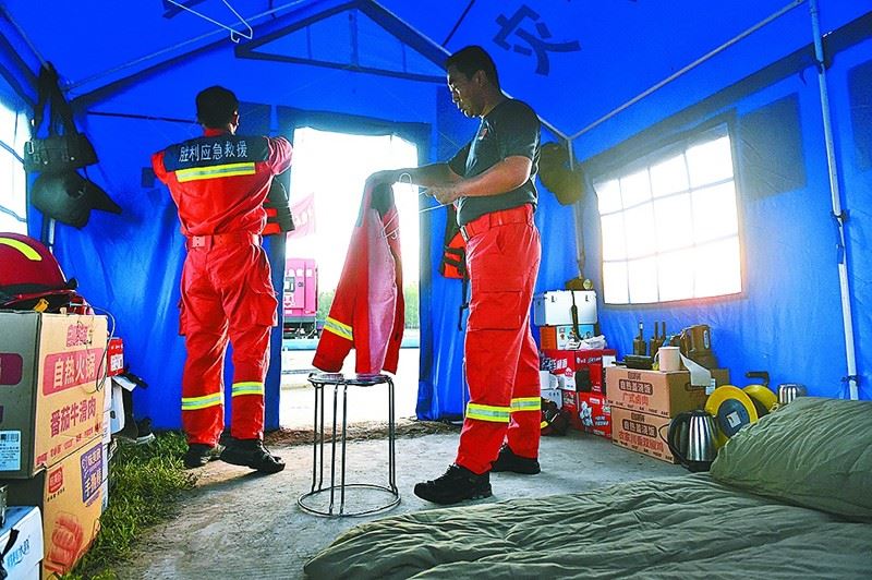救援隊在外堅持軍事化管理,簡易休息處的內務井井有條。