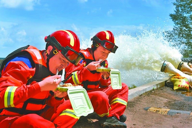 在這片黑土地上,勝利油田的救援隊伍全力以赴。為在陌生水域安裝排水泵,寧海危化品應急救援站經理黃鈺川帶頭跳進齊胸深的水中。為了讓隊員能夠保持充沛體力精力,濱州應急救援站黨支部書記唐棟連續5天,日夜堅守在排澇現場。所有隊員放棄休息,自發留在現場忙碌……