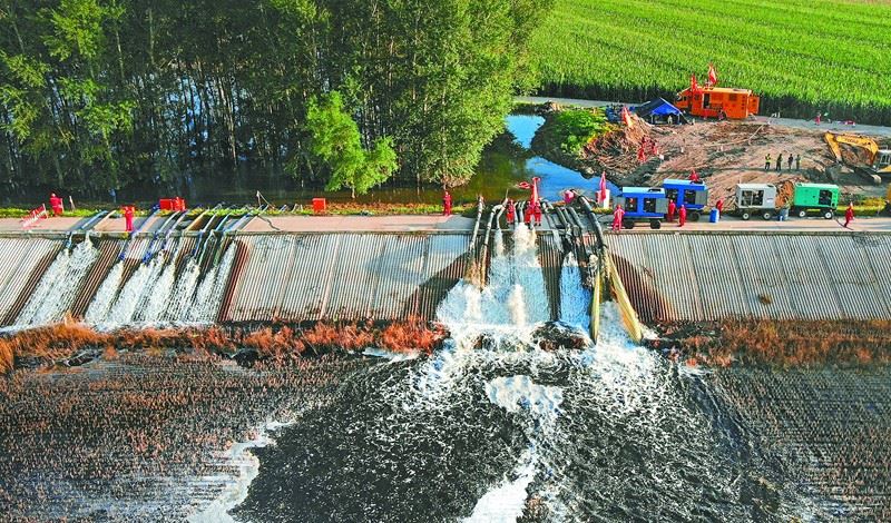 吉林省松原市扶余市雙城區拉林河大橋附近7號點排澇現場,勝利油田救援隊將農田積水排進河道。