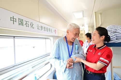 中國石化光明號健康快車5月駛抵2024年首站——河南駐馬店,截至7月4日,已在當地完成白內障復明手術642例。其間,河南駐馬店石油在96座加能站設立專項咨詢點,組織184名志愿者提供后勤保障、慰問關懷等志愿服務。圖為該公司志愿者為白內障患者提供服務。 本報記者 姜明武 攝 梁匯濤 劉亞迪 文
