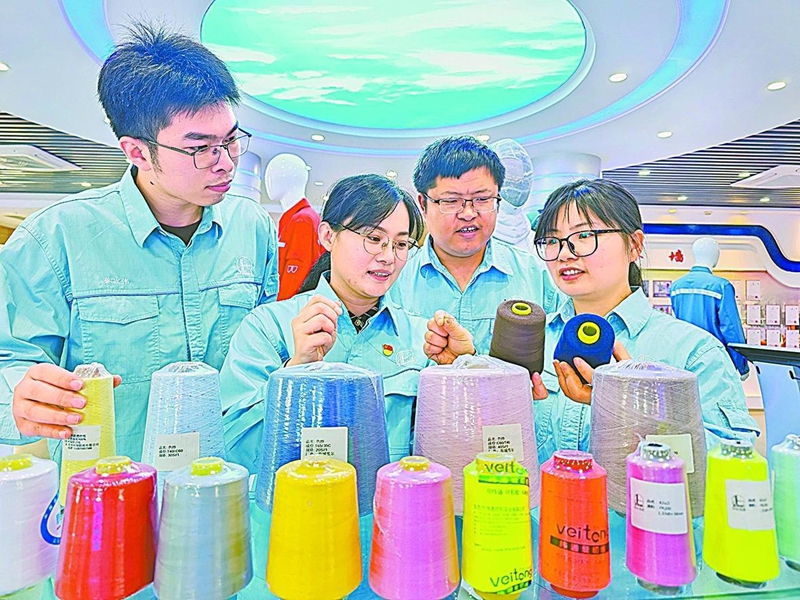 儀征化纖加強(qiáng)產(chǎn)研銷(xiāo)合作,大力開(kāi)拓綠色產(chǎn)品市場(chǎng),1月至4月,1.3D再生縫紉線(xiàn)纖維、再生滌綸短纖維等再生系列綠色產(chǎn)品產(chǎn)量同比增長(zhǎng)186%、銷(xiāo)量增長(zhǎng)159.5%。圖為5月8日工作人員查看1.3D再生縫紉線(xiàn)纖維產(chǎn)品。劉玉福 攝