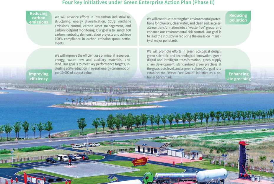 In April 2024, Sinopec launched Phase II of the Green Enterprise Action Plan, setting out 4 categories of quantitative indicators and 22 key tasks focused on reducing carbon emissions, reducing pollution, improving efficiency, and enhancing site greening. By 2028, Sinopec expects to have largely established a green production system, achieved expected progress toward carbon peaking, significantly improved its green competitiveness, and advanced the transformation of the petrochemical industry into a more high-end, intelligent, and green industry, helping to build a Beautiful China supported by a beautiful petrochemical industry.