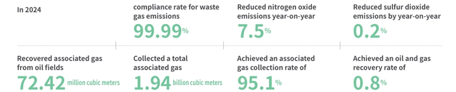 Sinopec has issued the Sinopec Implementation Plan for Sustained Air Quality Improvement, setting clear targets for emission reductions and outlining key air pollution control measures. Subsidiaries in key regions, such as Beijing, Tianjin, and Hebei, have successfully completed high-standard air quality assurance tasks during critical periods. In the Beijing–Tianjin–Hebei region and the Fenwei Plain, subsidiaries have actively implemented air pollution prevention and control measures throughout the autumn and winter seasons. The Company has also conducted environmental monitoring assessments and supervision across all oil and gas fields and refining subsidiaries. To reduce emissions, Sinopec has advanced the use of fully enclosed systems for oil and gas gathering and transportation. This included sealed production at wellheads, enclosed transportation at stations, upgraded gathering and transportation pipeline networks, pipeline systems to replace single-well truck transport, and the expanded use of associated gas from oil wells for power generation. Associated gas from scattered wells is also recovered to the greatest extent possible.