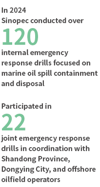 Sinopec has strictly enforced environmental management protocols for long-distance pipelines, prioritizing preventive maintenance through enhanced maintenance and inspection, as well as upgraded oil transmission systems, to improve operational safety and environmental reliability. The Company has also strengthened the management of large crude oil storage tanks through regular inspections and safety checks to ensure their safe operations. Leak management for equipment has been improved, particularly in addressing accelerated pipeline corrosion caused by factors such as deteriorating oil quality, supported by corrosion mechanism research and assessments of pipeline conditions. Based on these findings, Sinopec has introduced measures such as structural reinforcement, pipeline replacement, elevating buried pipelines, enhancing corrosion resistance, and applying internal anti-corrosion coatings at points, including stagnant flow zones, buried sections, terminal segments, and road crossings, to eliminate corrosion and leakage risks at the source. Sinopec has also strengthened offshore oil spill management and emergency response by upgrading its stockpile of response supplies and technical equipment.